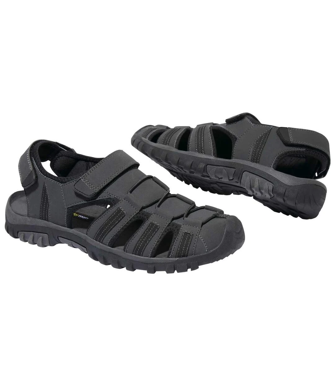 Ultra-practical and durable, these elasticated sandals are a must-have this summer! Easy to slip on and off, they can be adjusted using the 2 hook-and-loop tabs at the heel and on the top for a snug fit. Breathable, they will keep your feet cool, and are super-comfortable and easy to wear! Reinforced toes for added protection. TPR ridged soles to keep your feet firmly on the ground. Contrasting grosgrain. Outer: 100% synthetic nubuck-look polyurethane. Lining: 100% polyester. Colour: anthracite, black details / Ref.: H5136