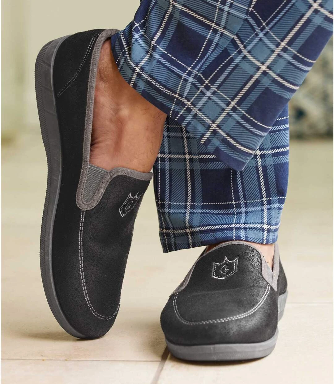 Comfort and warmth come guaranteed with these elegant black moccasins. They are made from soft faux-suede on the outside and the inside is fully lined with warm Sherpa. Thanks to the elasticated side panels, you can slip them on easily. Well-designed details include a tone-on-tone bias trim, contrasting topstitching and embroidery on the upper. TPR sole for a perfect grip. Upper and lining: 100% polyester. Trim: 100% cotton. Colour: black – Ref.: V0142