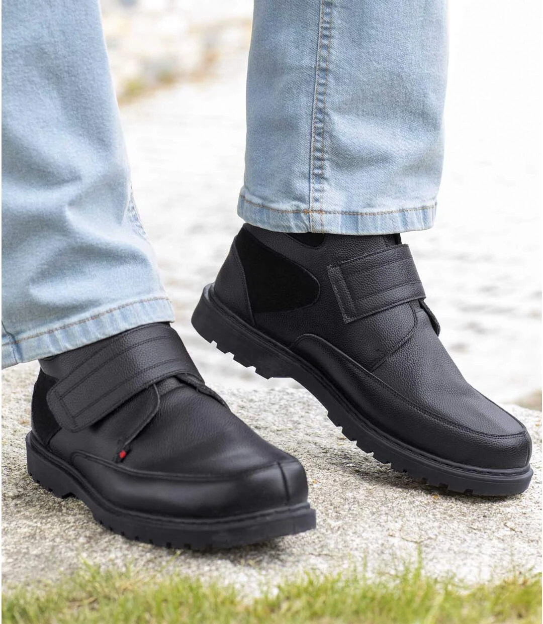 This winter, opt for these high-rise split leather boots lined with warm Sherpa fabric. With stylish tone-on-tone suede panels, they will protect your feet from the cold. They are also easy to slip on thanks to their wide opening with an adjustable hook-and-loop tab. You’ll love the ankle padding, memory foam insoles, as well as their ridged TPR outsoles that provide an excellent grip. Upper: 100% split leather. Lining and panels: 100% polyester. Colour: black – Ref.: V0182