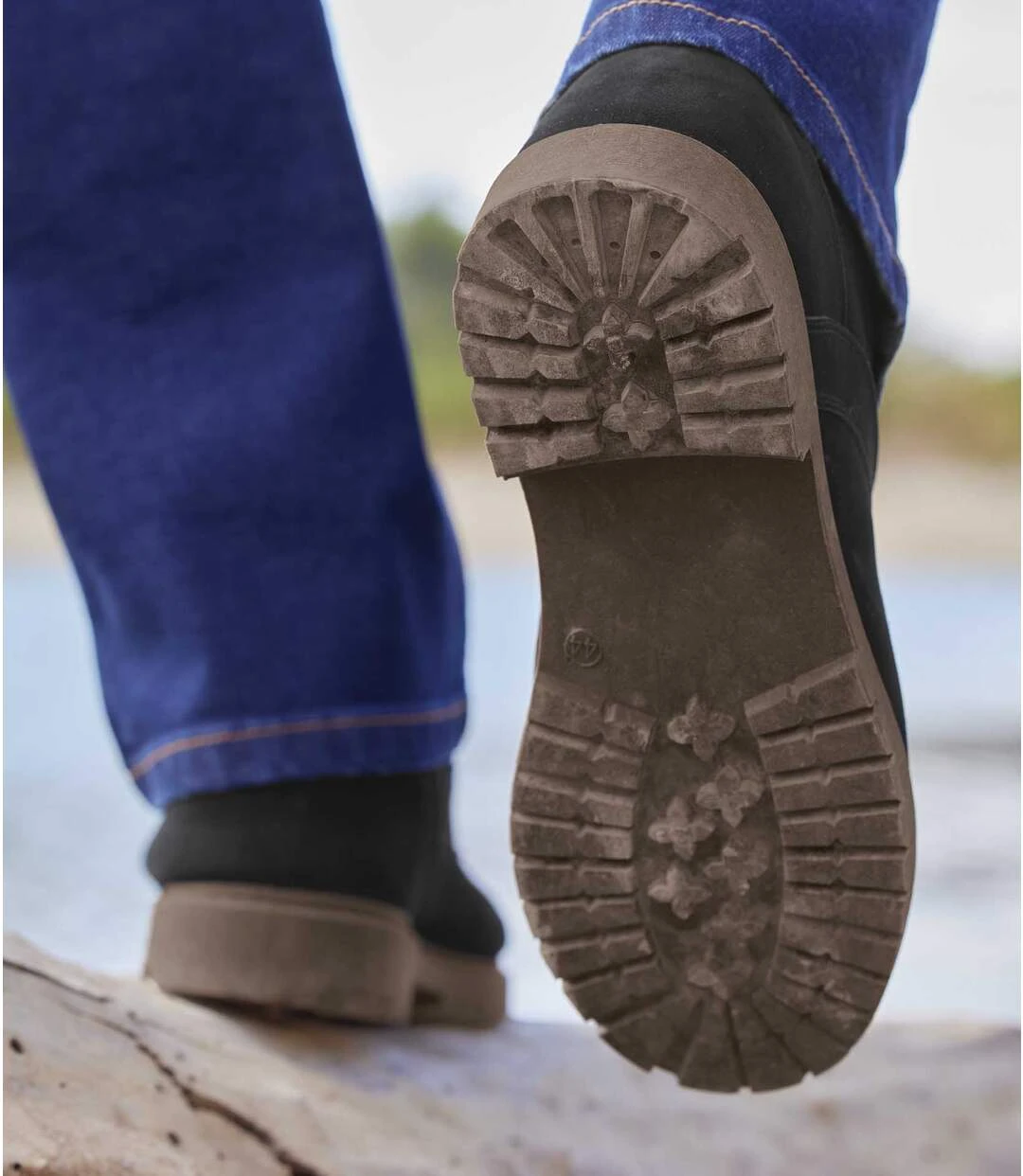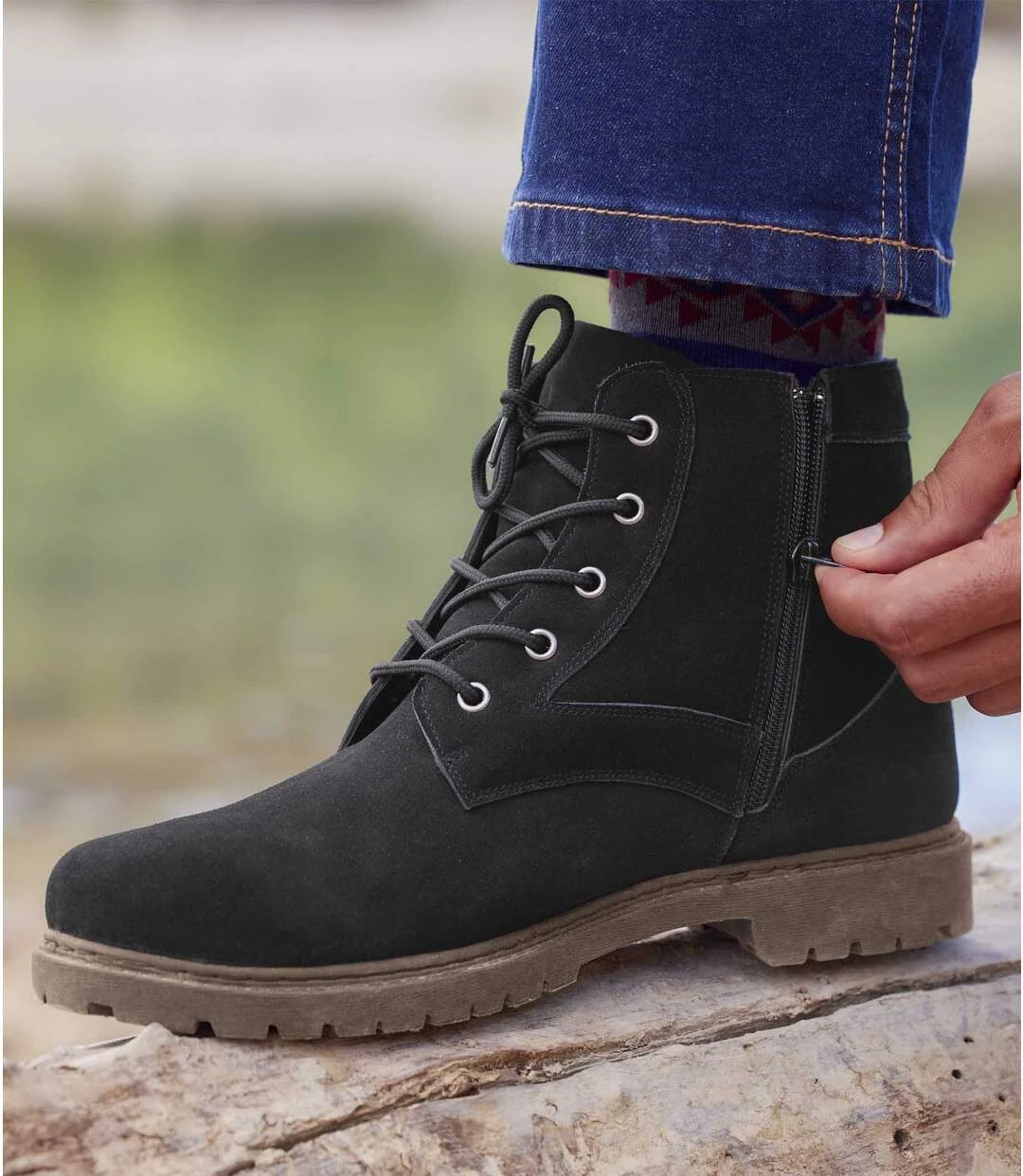 For adventurers looking for comfortable and durable boots, this water-repellent design made from suede-effect split leather is perfect! They slip on easily thanks to the side zip and offer great foot support with the sturdy lacing system (10 metal eyelets). Ridged outsoles in contrasting TPR for a perfect grip on the ground. Double topstitched finishes. Upper: 67% split leather, 33% polyester. Lining: 100% polyester. Brush clean. Colour: black / Ref.: M6127