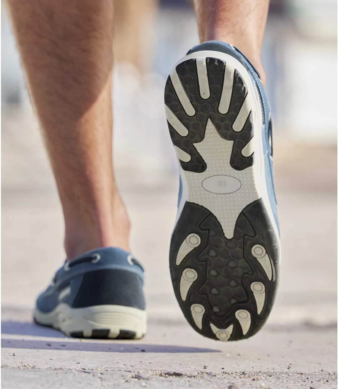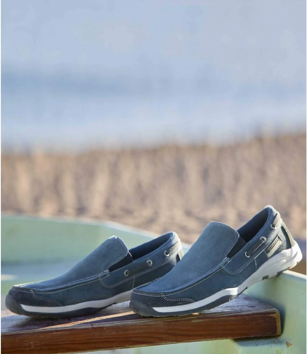 Switch up your style in these comfortable moccasins made from split leather with a suede-look finish! They are easy to slip on and off thanks to the elasticated sides and feature reinforced toes and heels as well as padded ankles. Top-quality finishes include metal eyelets and side laces inspired by traditional boat shoes, plus contrasting topstitching. Contrasting TPR outsoles for an excellent grip. Upper: 55% split leather, 45% polyurethane. Lining: 100% polyester. Brush clean. Colour: blue – Ref.: L6105