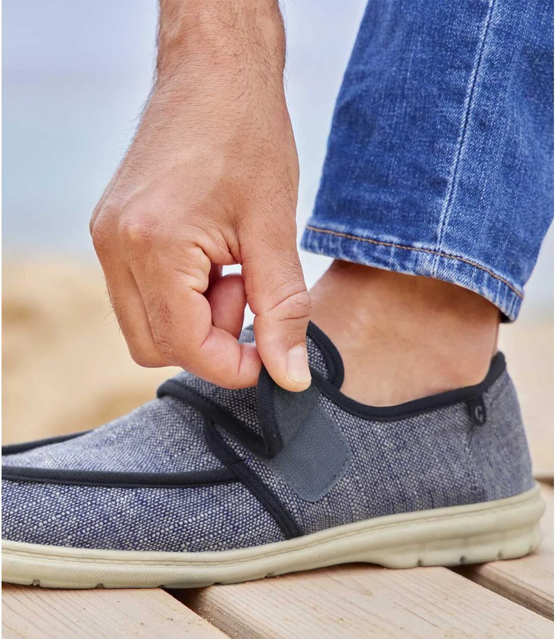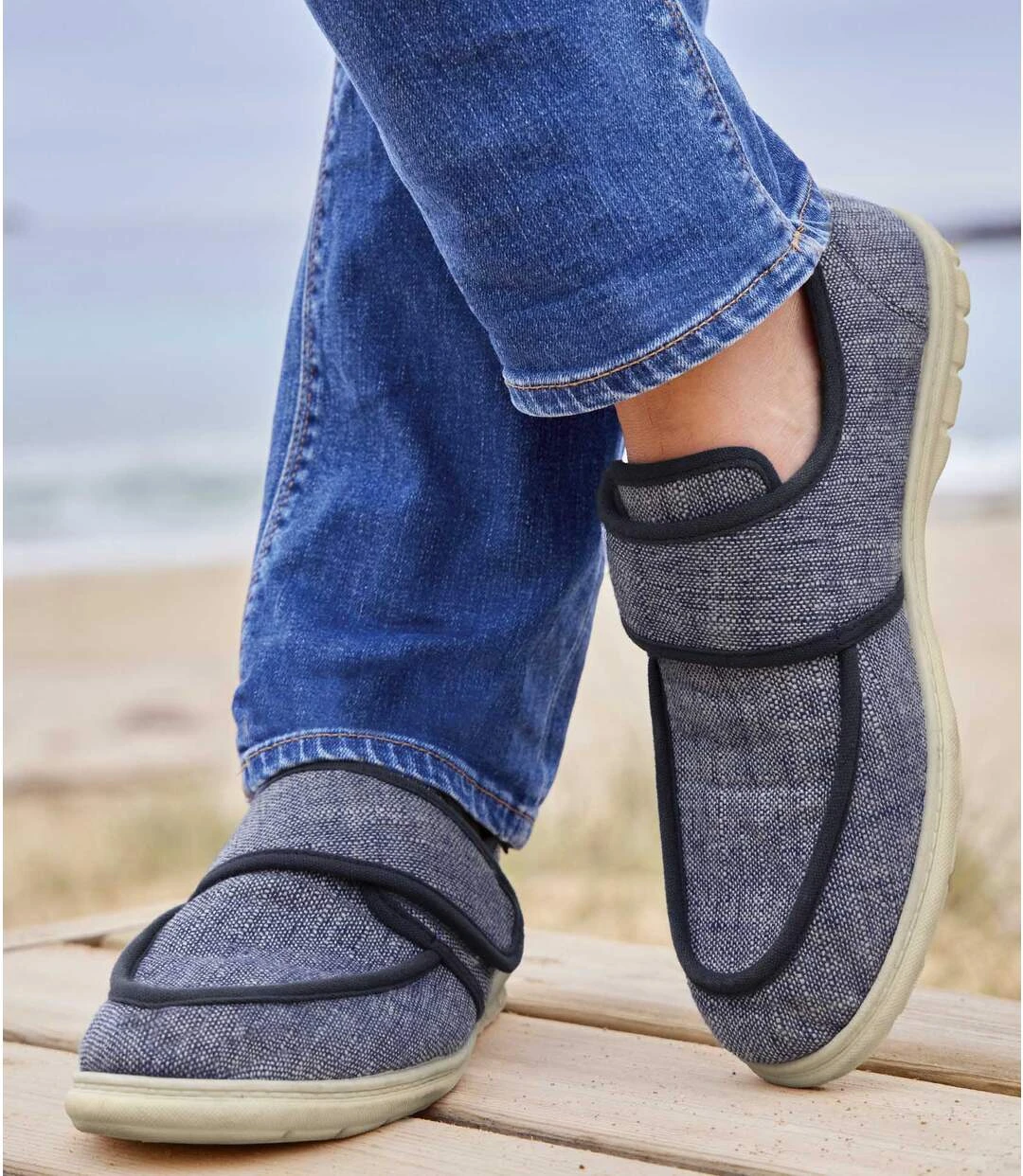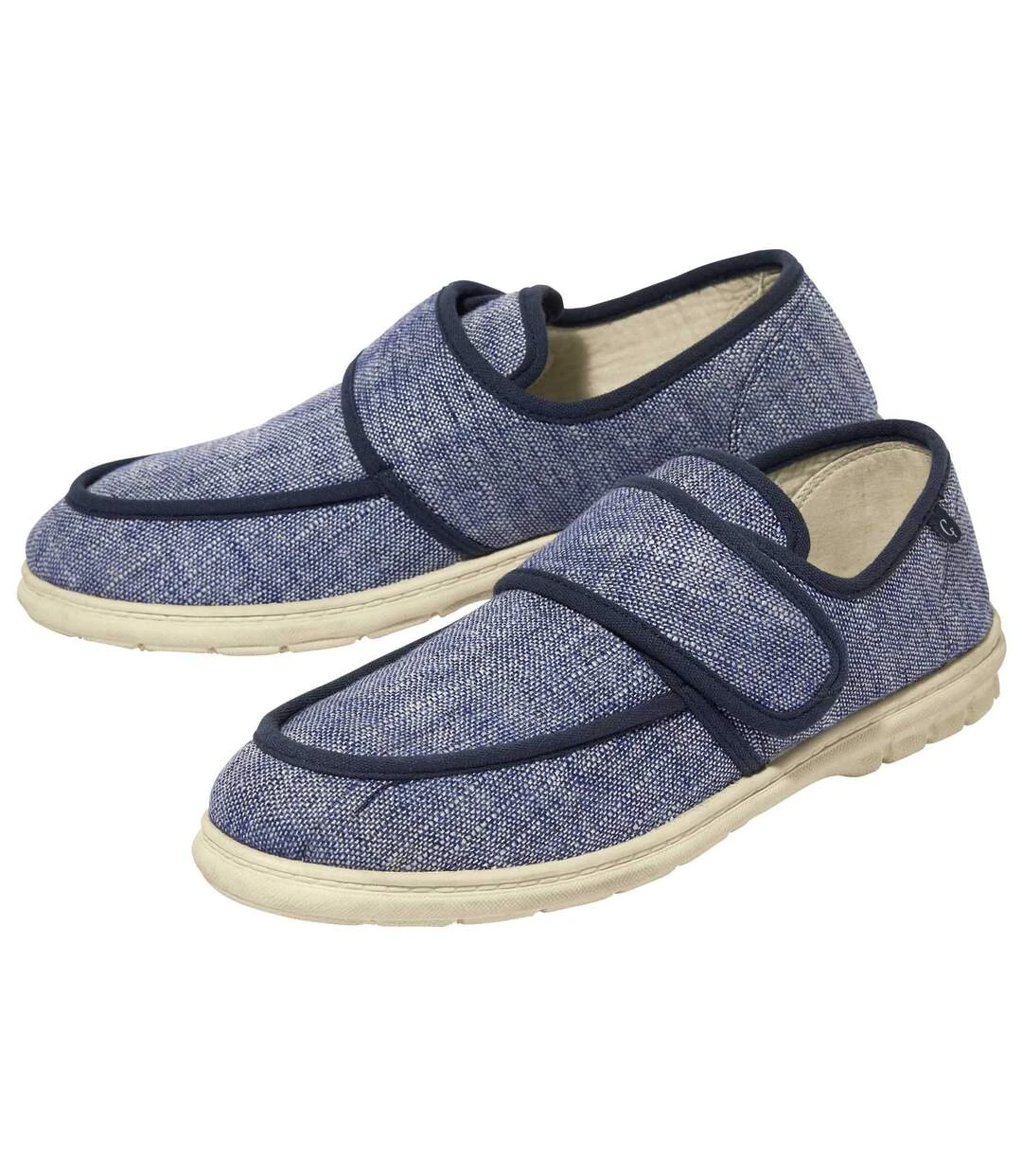 These summer moccasins are made from durable canvas and lined with padded foam. Lightweight and comfortable to wear, they feature navy piping and are easy to slip on thanks to the wide opening with a hook-and-loop tab. Memory foam insole and a hard-wearing and supple TPR outsole. Great with chinos or denim shorts! Upper: 100% polyester, lining: 100% cotton. Colour: blue / Ref.: V0148