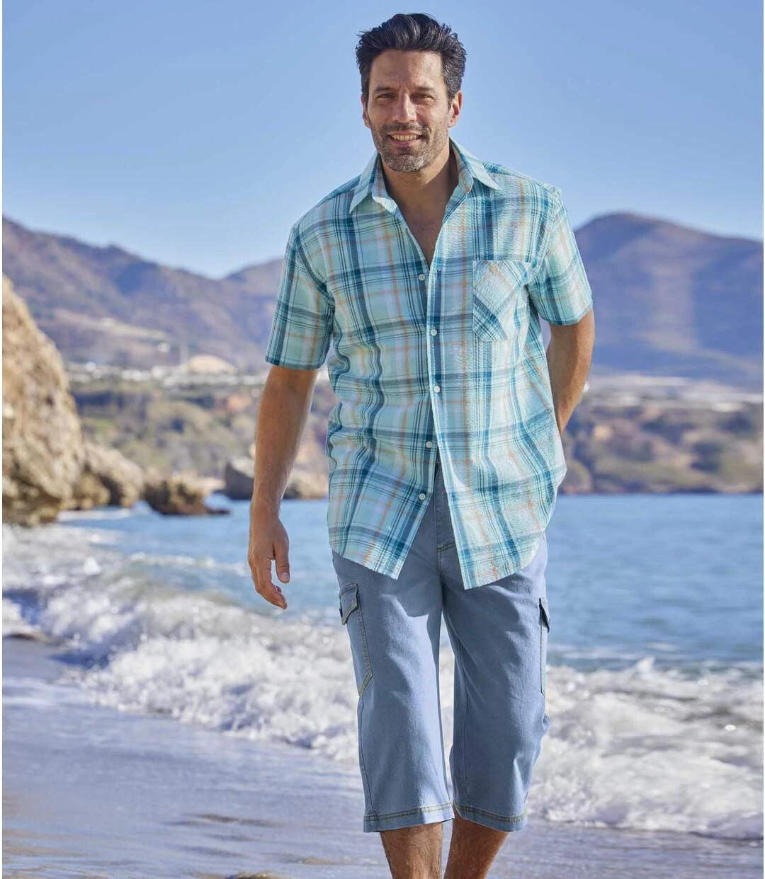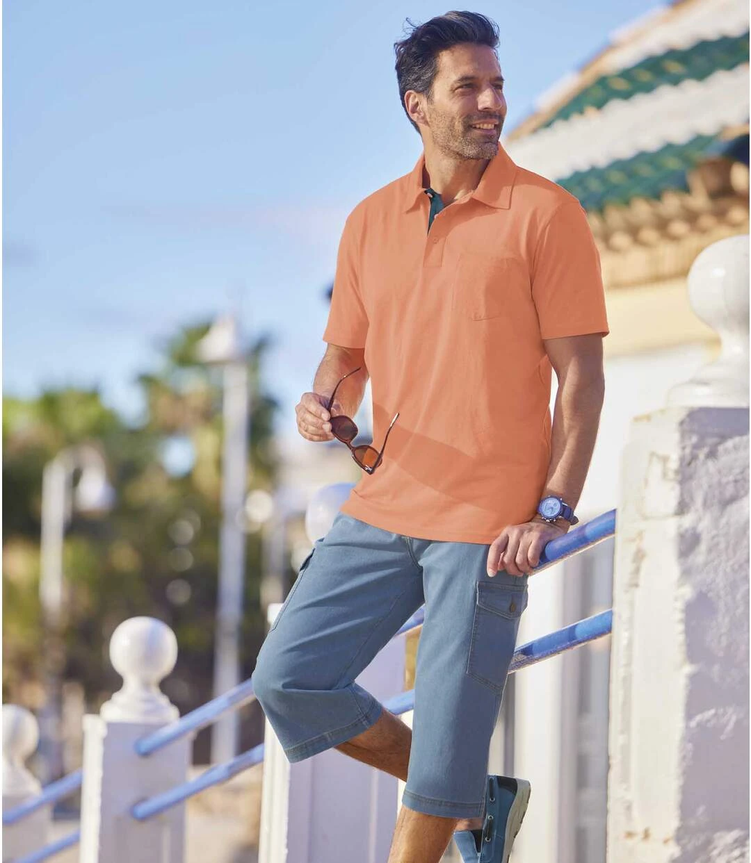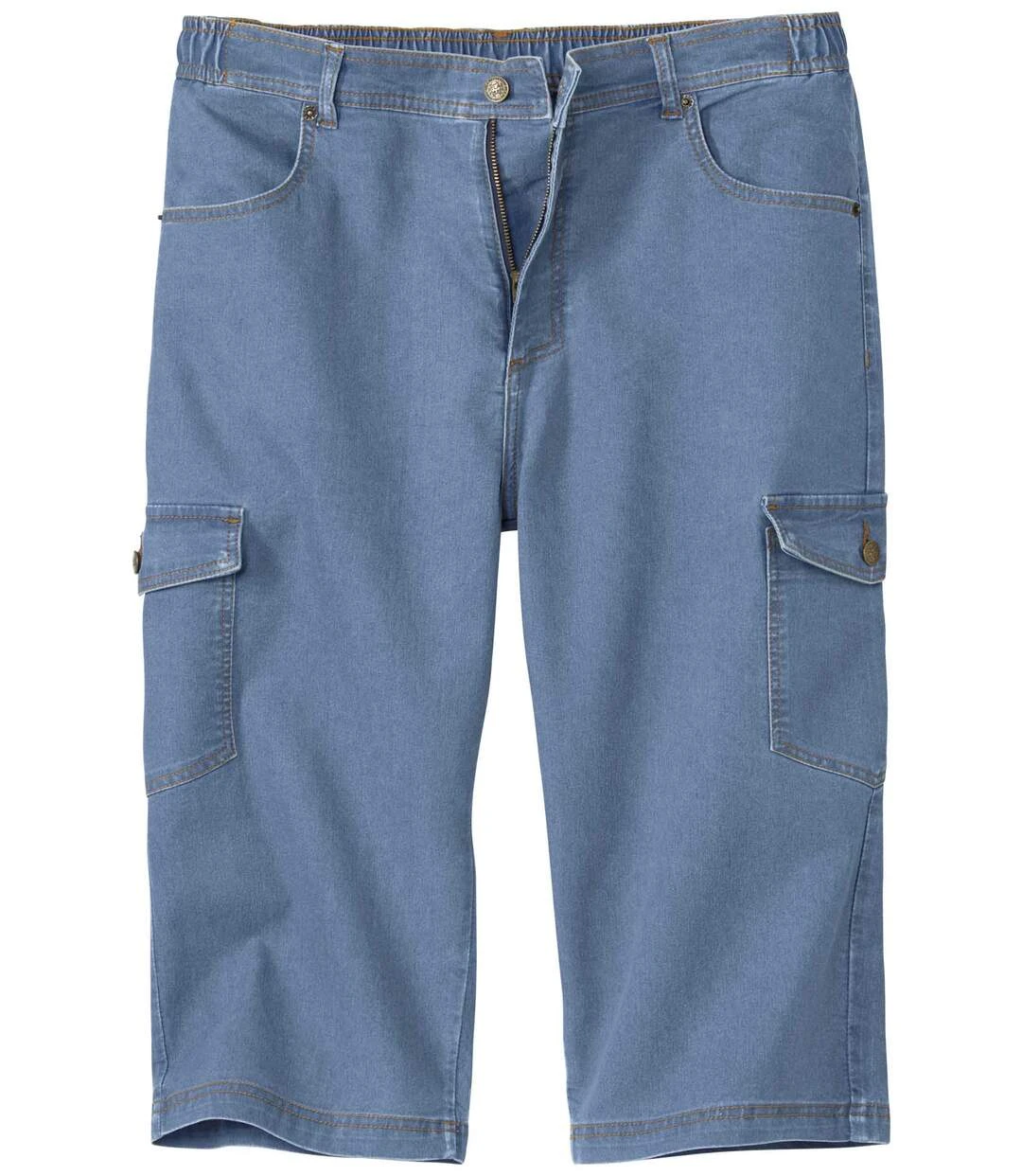 These comfortable cropped pants are a vacation essential! Made from supple yet hard-wearing stretchy denim (8.20 oz), they come with a three-quarters elasticated waistband and a zip-up fly and stud button fastening. 6 handy pockets: 2 stitched rounded pockets with rivets, 2 back patch pockets and 2 side pockets with buttoned tabs. Contrasting topstitching. Double topstitching along the hem. 80% cotton, 19% polyester, 1% elastane. Inner leg: approx. 17.7 in/45 cm and leg opening: approx. 10.2 in/26 cm for CA size M. Machine wash at 30°C. Colour: light blue – Ref.: L6133