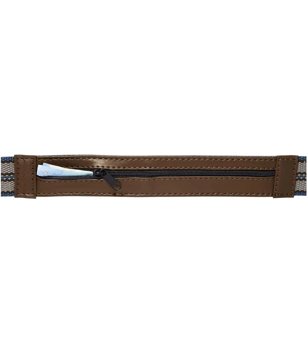 This belt is a must-have for your vacations! The zip-up inside pocket is ideal for safely storing coins, bills or even a key, and it is made from durable striped fabric. Faux-leather details. Square metal buckle. Canvas: 100% polyester. Details: faux-leather polyurethane. Colour: brown with stripes – Ref.: K4128