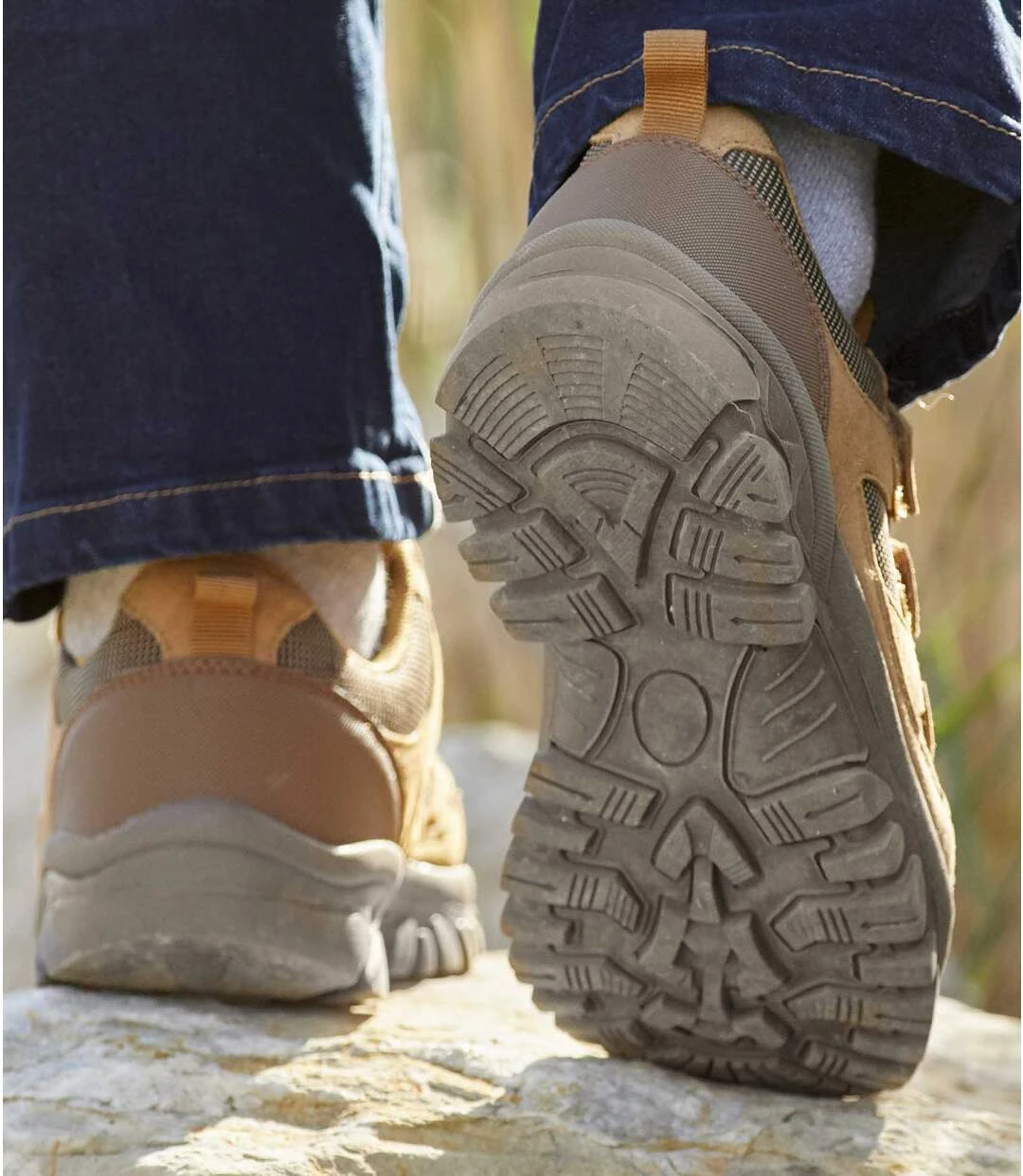 Half-sneakers, half-moccasins, these are the perfect walking shoes for when you want to combine comfort with style. This lightweight pair is made from nubuck-look split leather, and have been reinforced on the outside with hard-wearing polyurethane panels to support your feet on any terrain. They are also easy to slip on and fasten using the hook-and-loop tabs, and have padded ankles for extra comfort. Ribbed, non slip TPR soles. Outer: split leather and polyester with water-repellent coating. Lining: 100% polyester. Colour: camel – Ref: F7120