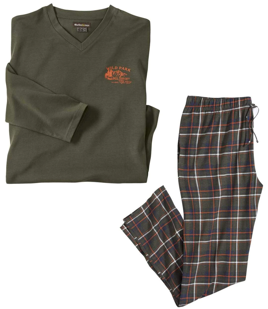 Opt for these super-comfortable pyjamas made from soft, supple and easy-to-maintain jersey (approx. 145 g/m²)! The plain long sleeve top features a 1×1 ribbed V-neck and a small print on the chest. The comfortable checked bottoms come with an elasticated drawstring waistband and 2 side pockets. Double topstitched finishes. 60% cotton, 40% polyester. Top front and back length: approx. 29.1 in/74 cm, bottoms inner leg: approx. 33.1 in/84 cm and hem: approx. 8.7 in/22 cm for CA size M. Machine wash at 30°C. Iron the bottoms inside out. Colour: khaki top and checked bottoms / Ref.: M6144