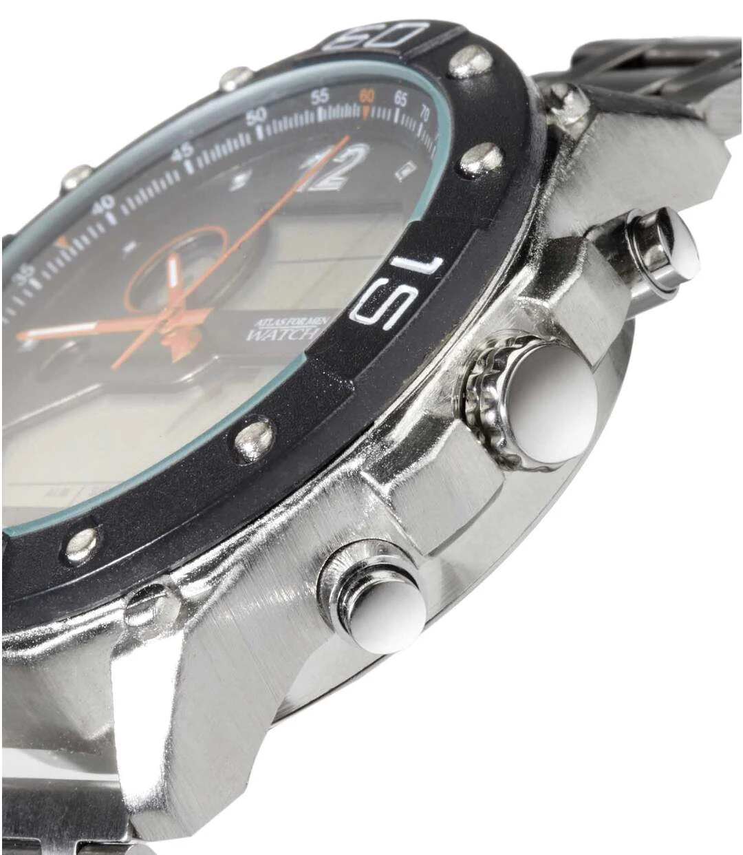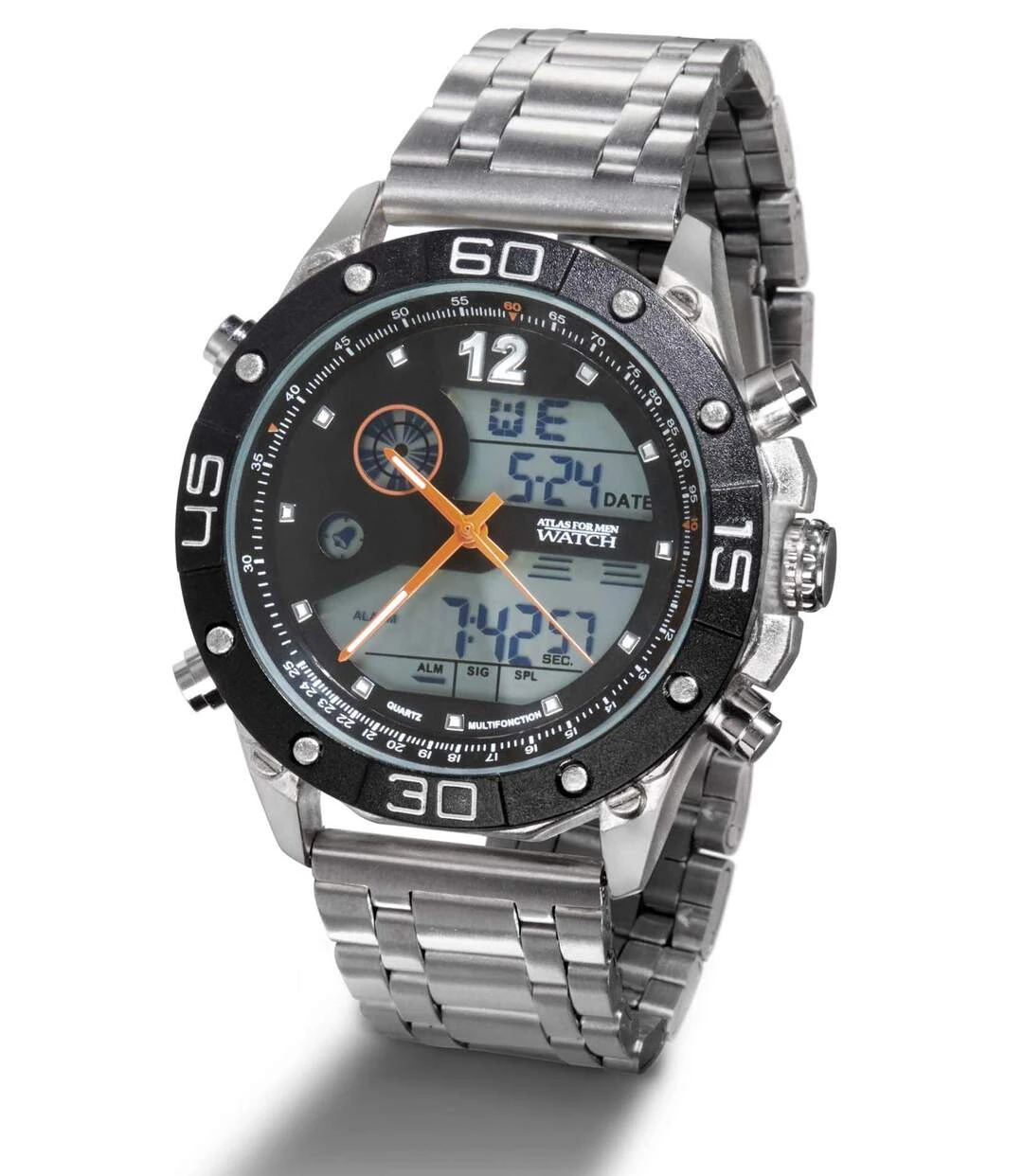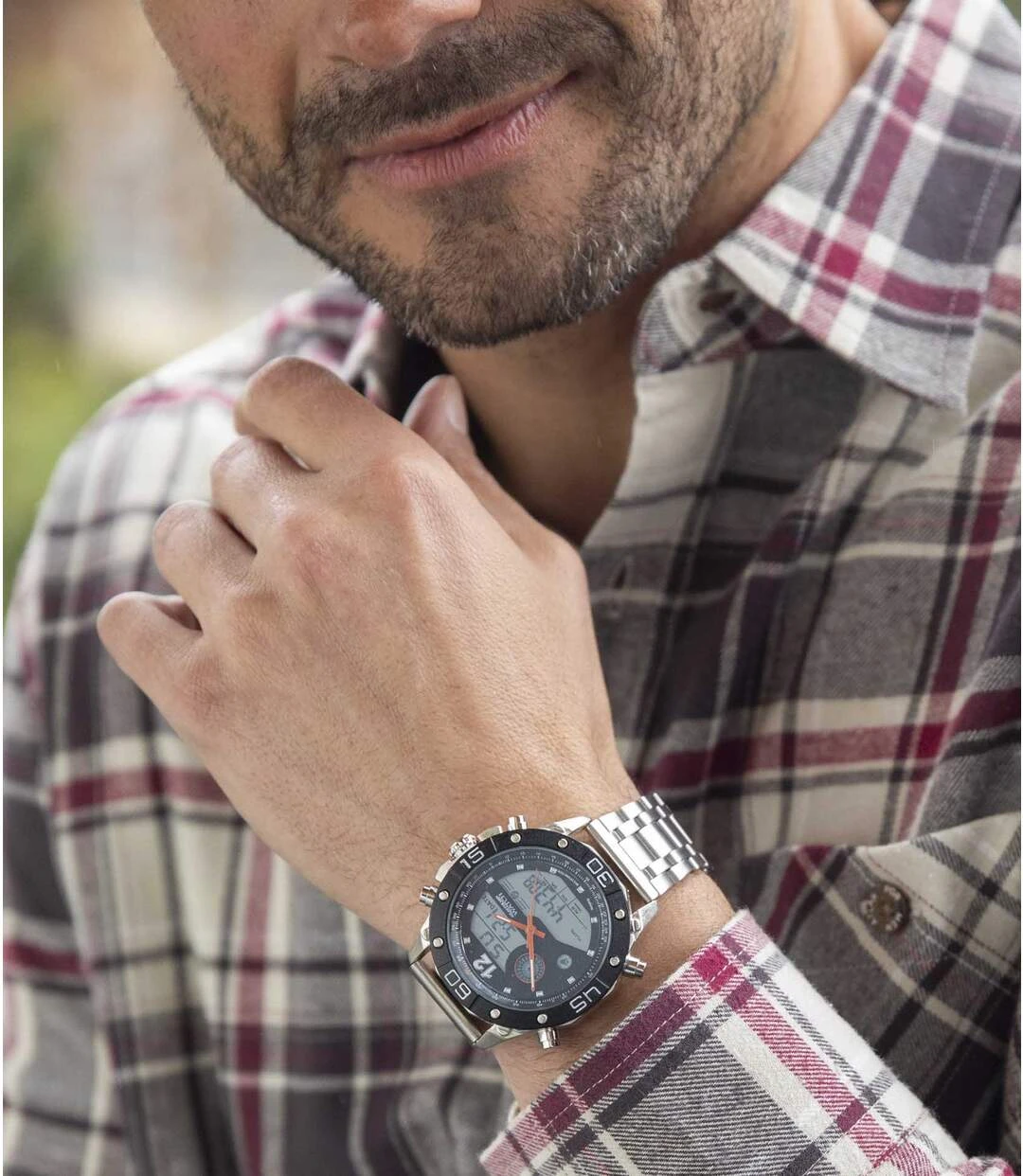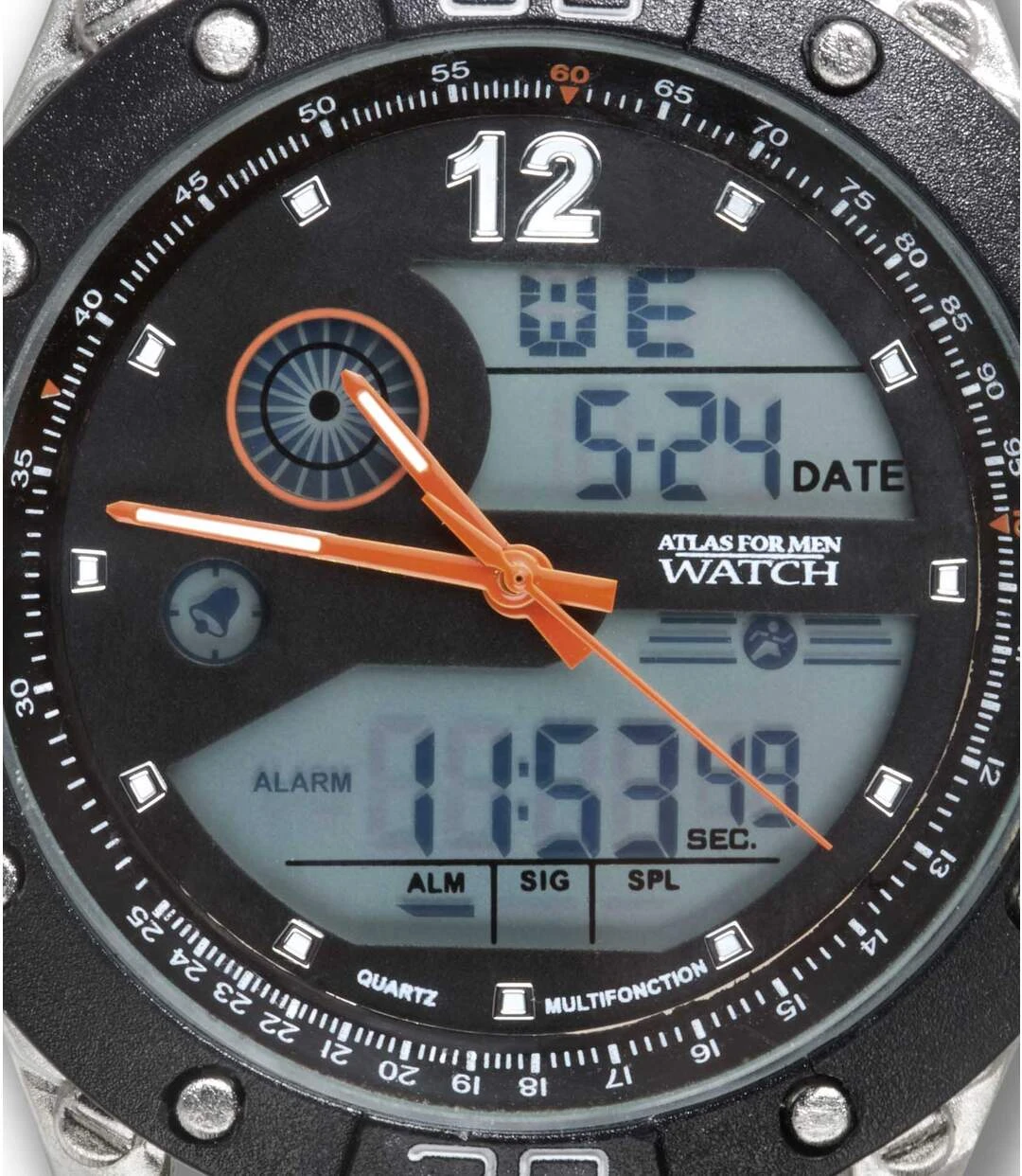 Ideal for sports lovers, this watch combines style and durability. Practical, it has a dual display (analogue and digital) with 3 hands (2 of which are glow-in-the-dark) and 2 backlit LCD screens for optimal visibility, even at night. It also features a date display, alarm and a handy stopwatch function to monitor your performances. Its metal bracelet with a folding clasp is durable and easy to adjust. You’ll love the sporty look of its black dial and bezel with orange details. Quality finishes include embossed hour markers, protective scratch-resistant mineral glass, and casing with a nickel-free, hypoallergenic coating. This high-performance design comes in a stylish gift box – perfect to offer to a loved one or a treat for yourself! User manual included. Face diameter: approx. 1.7 in/4.4 cm – Ref.: M3144