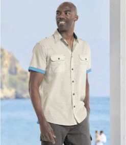 This chic and casual slub fabric shirt (approx. 110 g/m²) will win you over with its pilot-style cut and contrasting details. The stylish design features epaulettes, 2 chest pockets with button down flaps, and contrasting turquoise poplin on the collar band and short sleeve turn-ups. Roll the sleeves up or leave them down to change your look! Grey topstitching and buttons. Back panel with 2 back pleats and a rounded hem. 60% cotton, 40% polyester. Back length: approx. 31.5 in/80 cm for CA size M. Machine wash at 30°C. Colour: ecru, turquoise details – Ref: K1130