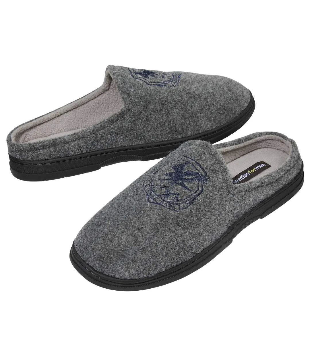 With a felted wool look, these slippers will keep your feet super warm this winter thanks to their soft fleece lining! Quick and easy to slip on, they are finished with a rim at the heel to prevent your foot from slipping out. Non-slip TPR sole. Small embroidered eagle logo on top. 100% polyester. Colour: grey – Ref: G7140
