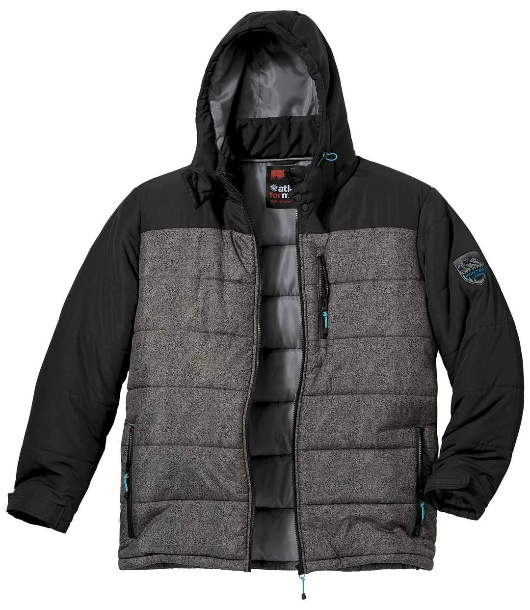 Combine warmth and style with this cozy, water-repellent puffer jacket (approx. 320 g/m²). You’ll love the mottled print and contrasting panels on the zip-up funnel neck, shoulders and sleeves. Practical, it is cut to a generous length and has 5 pockets: 3 zip-up pockets on the outside and 2 hook-and-loop pockets on the inside. You’re guaranteed to stay well-insulated with the funnel neck, lined zip-off hood, cuffs with hook-and-loop tabs and adjustable drawstring hem. Crest on the sleeve. Contrasting zip pulls and drawstring. 100% polyester. Back length: approx. 32.7 in/83 cm for CA size M. Machine wash at 30°C. Colour: grey and black – Ref: G9122