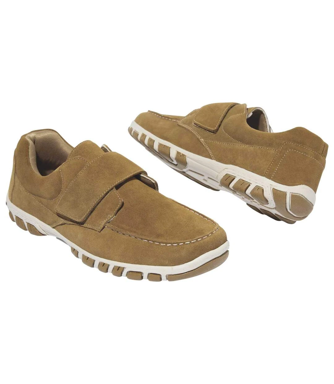 These low-rise moccasins are made from nubuck-look split leather. They are easy to slip on thanks to the wide hook-and-loop opening on the upper. They also have a two-tone ridged TPR sole, for a perfect grip. Quality finishing touches include reinforced edges, contrasting topstitching and a fabric lining. Upper: 100% split leather, lining: 100% polyester. Brush clean. Colour: camel / Ref.: J0106