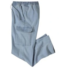 These jeans in slightly stretchy denim (9.5 oz) are comfortable to wear thanks to the fully elasticated waistband with a hidden drawstring. They feature 2 topstitched Italian pockets and 1 cargo pocket with a hook-and-loop flap. 98% cotton, 2% elastane. Inner leg: approx. 33.1 in/84 cm and leg opening: approx. 8.7 in/22 cm for CA size M. Machine wash at 30°C. Colour: light blue / Ref.: K2144