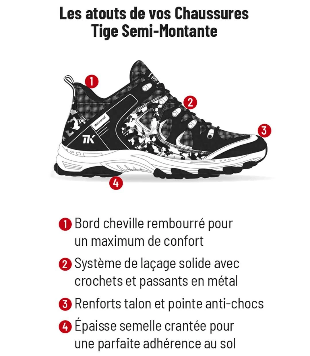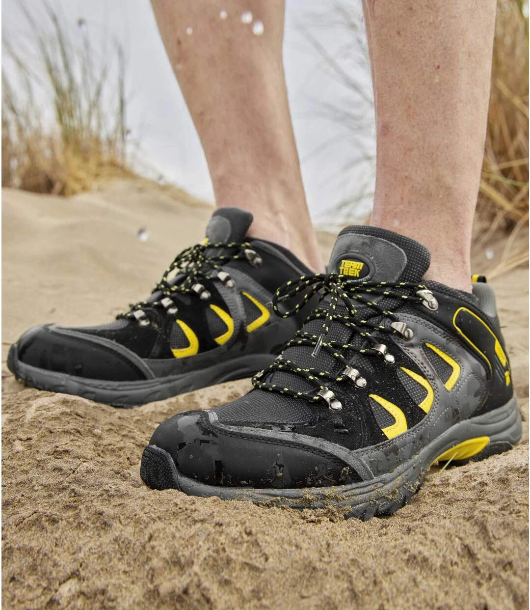 Lightweight, durable and versatile, these Team Trek walking shoes are ideal for all hikers, from amateurs to experts! The mid-rise design and robust lacing system with metal hooks and loops ensure great support. This all-terrain pair also has reinforced heels and toes for optimum strength and enhanced protection. When it comes to comfort, you’ll love the tongue and ankle padding, as well as the memory foam insoles. The phylon midsoles and rugged TPR outer soles guarantee good cushioning and an excellent grip. Made from hard-wearing, waterproof materials (a combination of suede-look leather, camouflage-print polyurethane and breathable mesh fabric), you’ll also love this trendy design for its grey and black tones and yellow details. Well-designed finishes include round laces and heel tabs made from two-tone grosgrain, plus a rubber label. Lining: 100% polyester. Colour: black, grey camouflage print and yellow details – Ref.: Y3022
