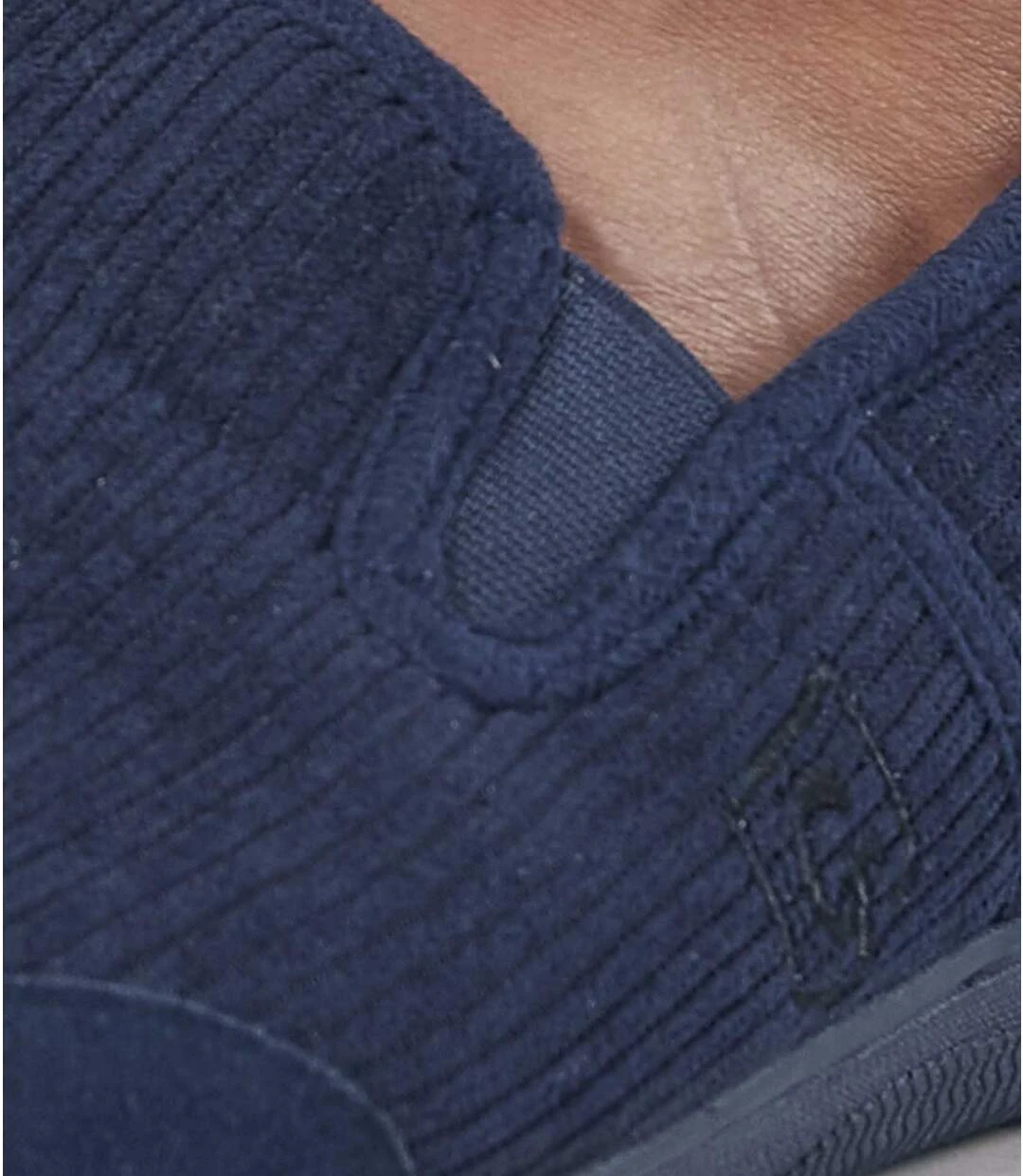 With their corduroy upper and soft Sherpa lining, these slippers were designed for cold weather. They are easy to slip on and off thanks to their elasticated sides, and provide excellent support. Quality finishes include memory foam insoles and hard-wearing, insulating TPR outsoles, plus suede-effect leather inserts at the toes, heels and trim. Small embroidered detail on the side. Corduroy and Sherpa fabric: 100% polyester. Inserts: 100% split leather. Colour: navy – Ref.: V0180