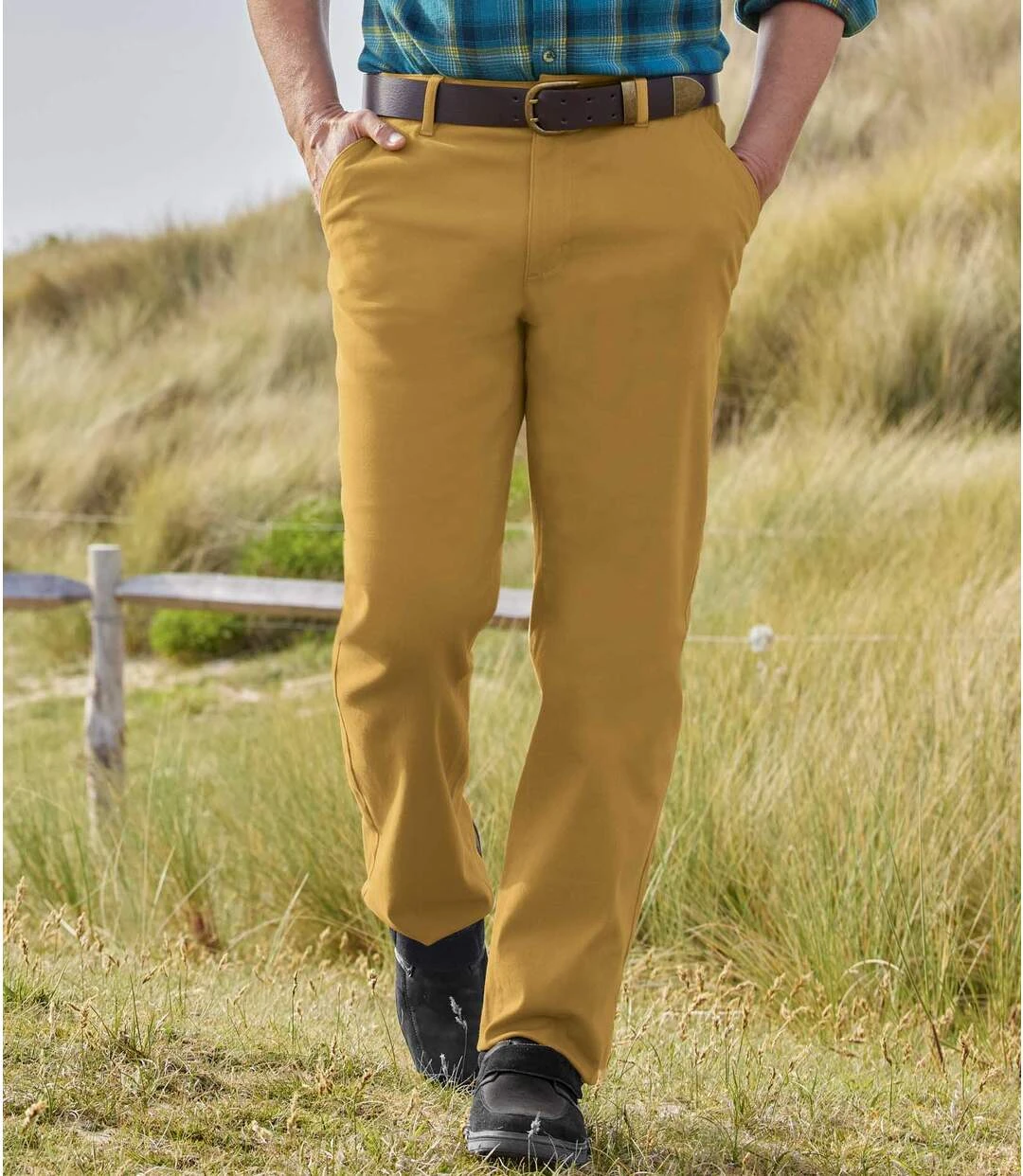 These chinos come in bright ochre and have a casual straight-cut design. They are made from durable, comfortable and stretchy twill fabric (approx. 250 g/m²). Flat waistband with belt loops that fastens with a zip-up fly and stud button. 2 topstitched Italian pockets on the front and 1 welt pocket on the back. 2 back pleats. 98% cotton, 2% elastane. Inner leg: 33.9 in/86 cm and leg opening: approx. 8.5 in/21.5 cm for CA waist 34. Machine wash at 30°C. Colour: ochre / Ref.: K6111