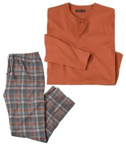 These soft cotton pyjamas (approx. 160 g/m²) feature a plain Henley top and checked pants. Quality details include a ribbed crew neck and button placket with 3 tone-on-tone buttons on the top, and a comfortable elasticated waistband with a drawstring on the bottoms. Double topstitching on the sleeves and hem. 100% cotton. Top back length: approx. 29.1 in/74 cm, pants inner leg: approx. 31.9 in/81 cm, leg opening: approx. 8.9 in/22.5 cm for CA size M. Machine wash at 30°C. Iron the pants inside out. Colour: orange and grey checks – Ref.: K7140