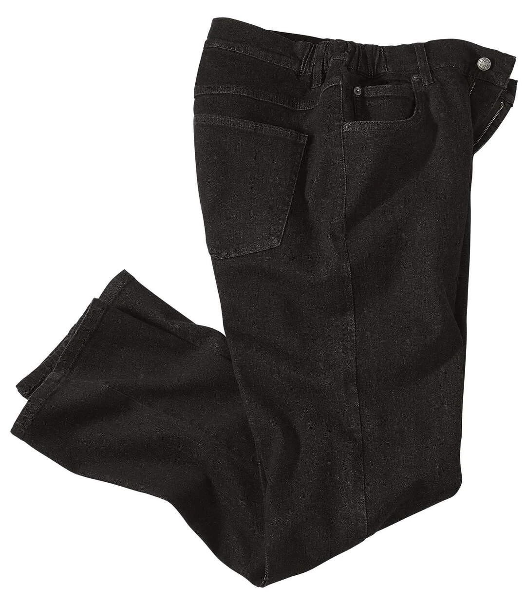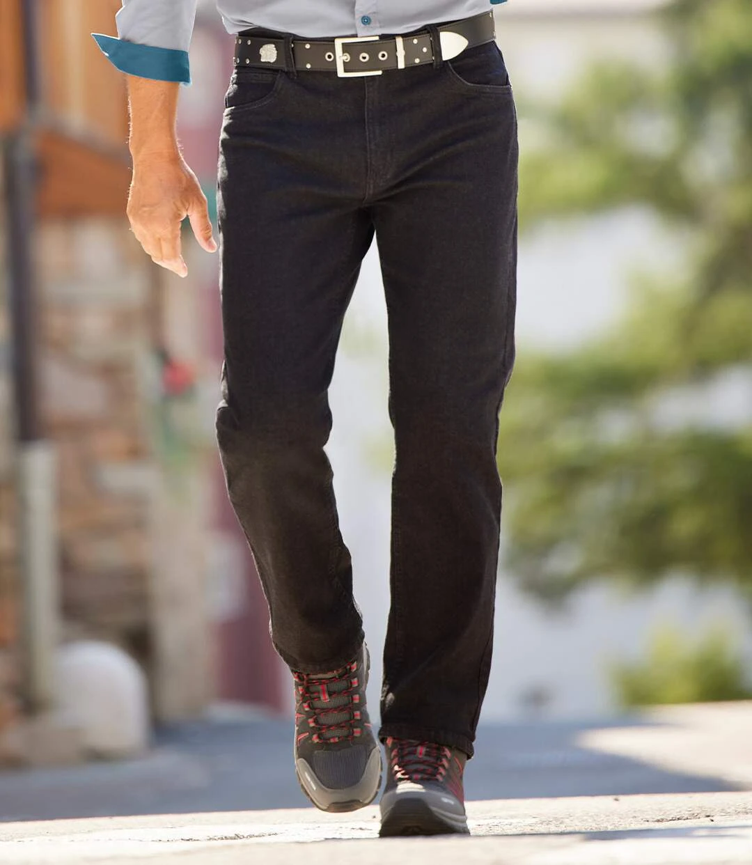 These stylish straight cut black jeans are comfortable to wear, made from slightly stretchy denim (11 oz). They have a flat waistband with belt loops and elasticated sides for extra give. This classic design has 5 pockets: 2 stitched rounded pockets with rivets and 1 coin pocket at the front, plus 2 patch pockets at the back. Zip-up fly with stud button. Tone-on-tone topstitching. 98% cotton, 2% elastane. Inner leg: approx. 33.9 in/86 cm, and leg opening: approx. 8.7 in/22 cm for CA waist 34. Machine wash at 30°C. Colour: black – Ref: J3120