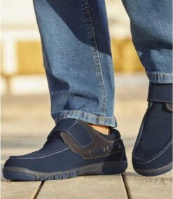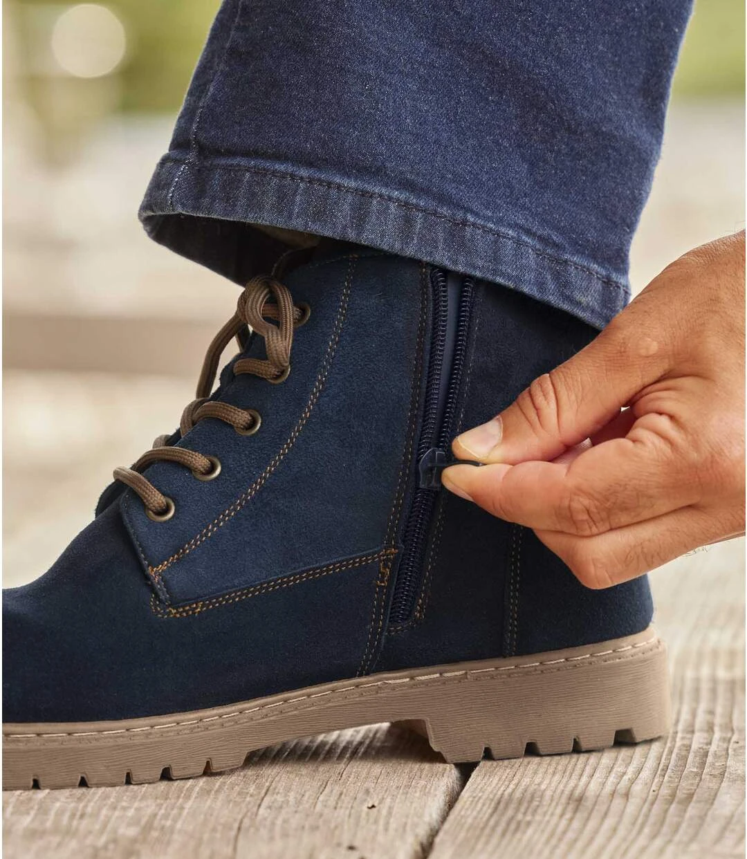 You’ll love these stylish boots in soft, suede-look split leather with contrasting details (metal eyelets, round laces, topstitching and outsole) in navy blue. This practical, water-repellent pair is easy to slip on and off thanks to the zip-up fastening on the side. Lace-up front to ensure a perfect fit. Ridged TPR sole for a good grip. Upper: 65% suede-look split leather, 35% polyester. Lining: 100% polyester. Brush clean. Colour: navy / Ref.: K7115