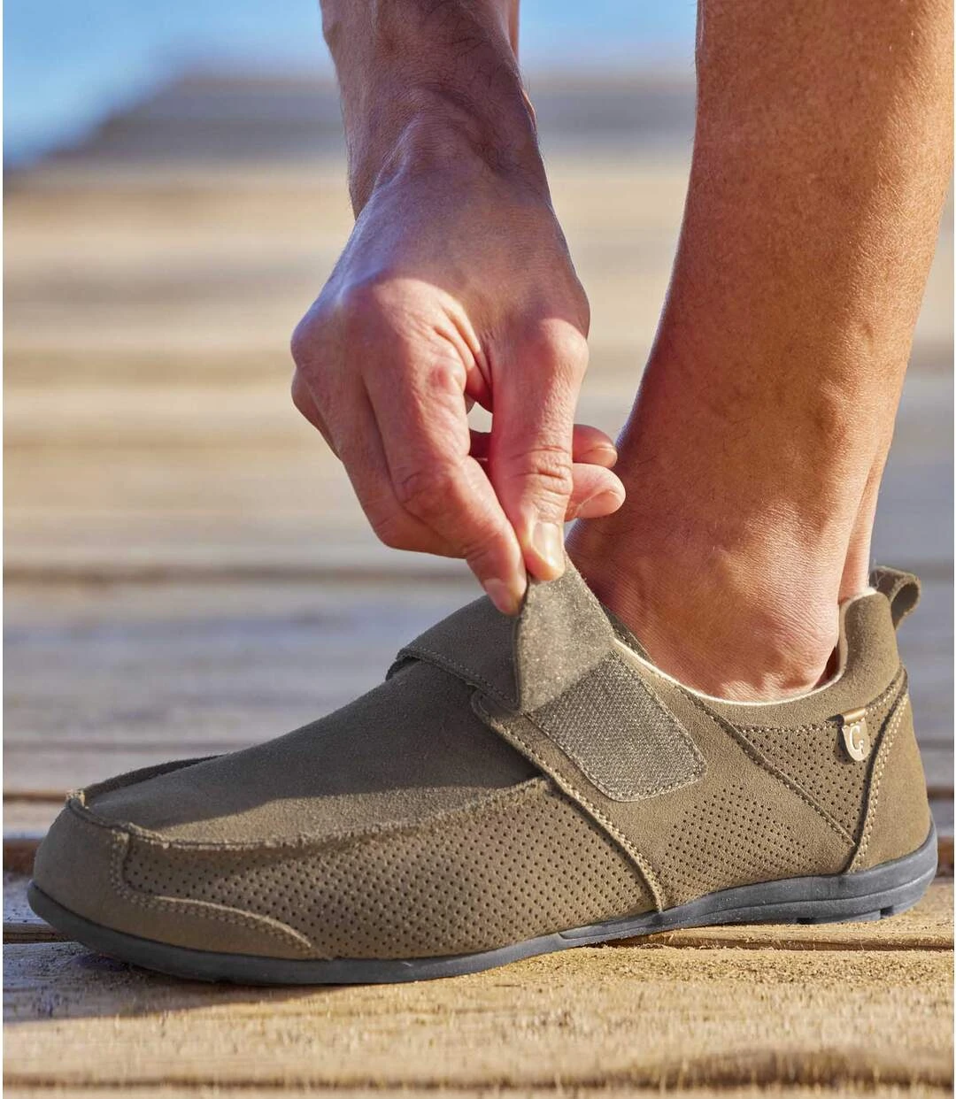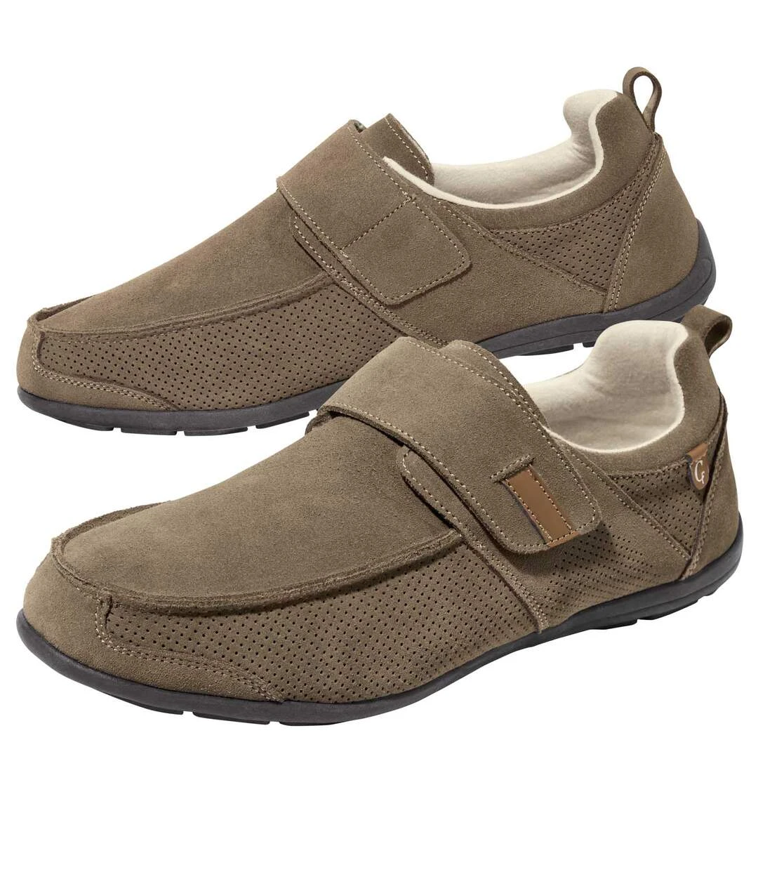 These practical and casual moccasins with a wide opening and hook-and-loop tab are easy to slip on. Made from stylish split leather, they are also original with perforations at the sides, toe and heel. They feature quality finishes and are comfortable to wear thanks to their memory foam insoles and supple, hard-wearing TPR outsoles. Upper: 100% split leather. Lining: 100% cotton. Colour: taupe – Ref.: V0170