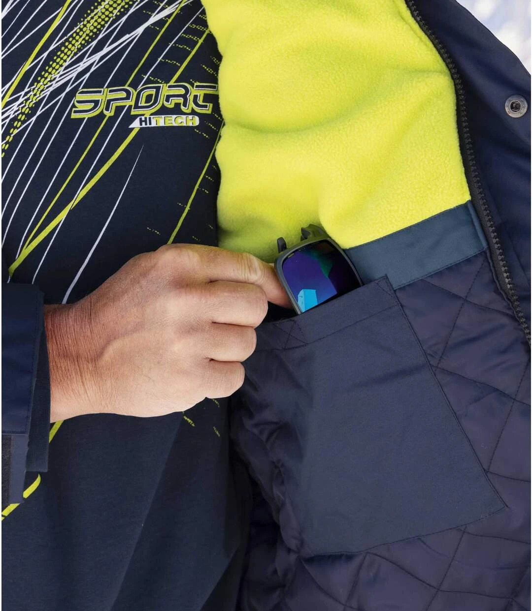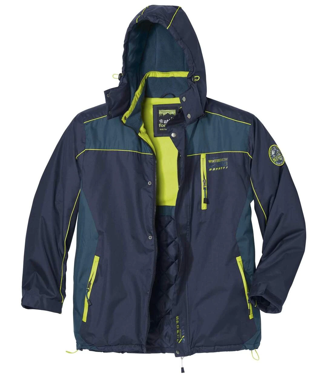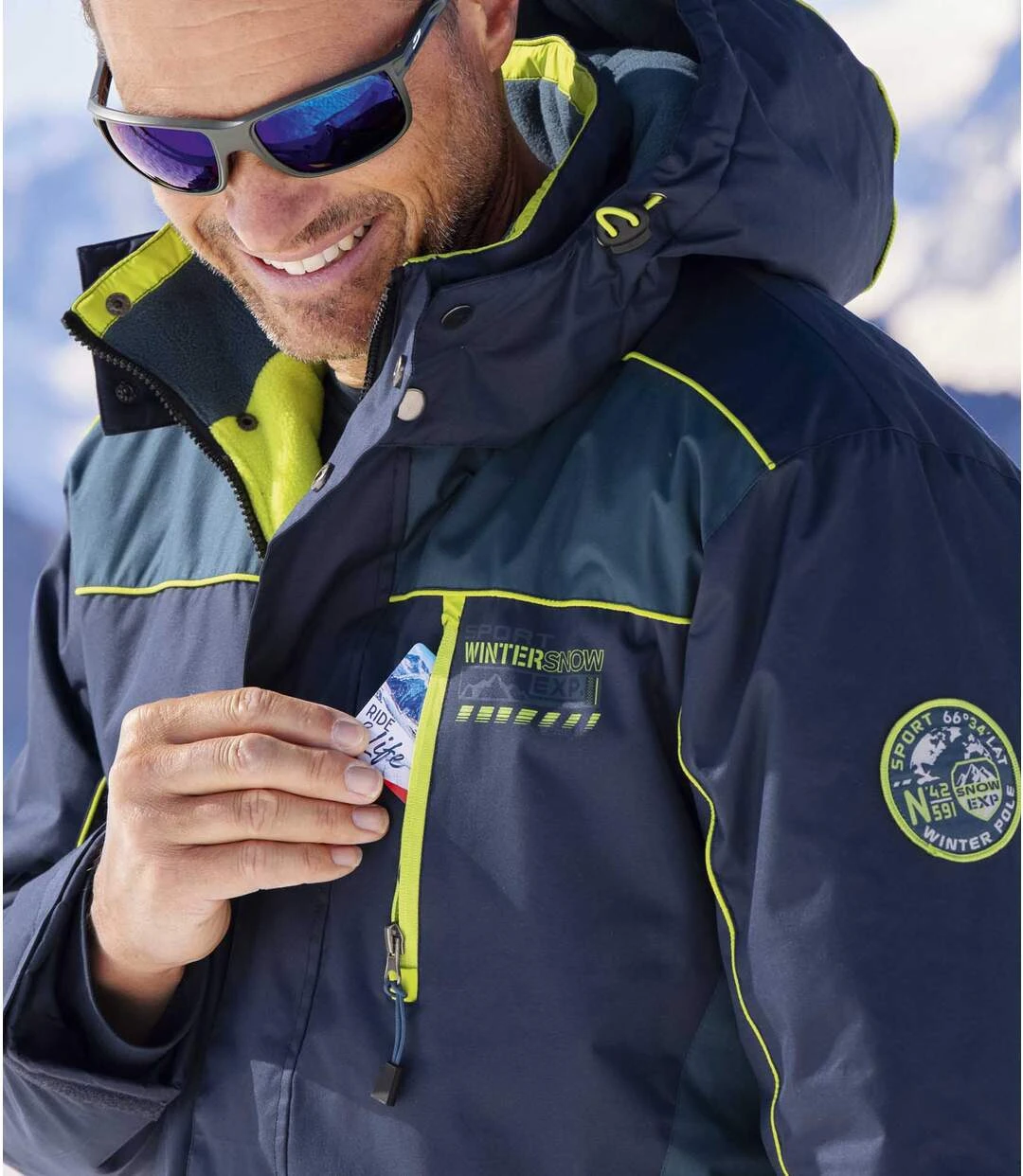 For a sporty look, choose this parka with contrasting panels and piping! Made from water-repellent microfibre, it is lined with microfleece at the top and warm quilting at the bottom (approx. 395 g/m²). For extra protection, it also has a double fastening (zip under a press-stud placket), hook-and-loop cuffs, as well as an adjustable drawstring hem and detachable hood. 5 handy pockets: 3 outer zip-up pockets and 2 inside hook-and-loop pockets. Perfect for hitting the slopes at speed! Sporty print and label. 100% polyester. Back length: approx. 32.7 in/83 cm for CA size M. Machine wash at 30°C. Colour: navy – Ref.: J4114