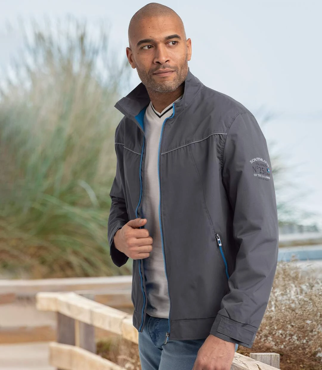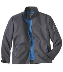 Lightweight and super resistant, you’ll definitely want to have this water-repellent microfibre (approx. 210 g/m²) windbreaker at the ready to keep you perfectly protected from sudden downpours! The body of this full-zip jacket has a mesh lining, while the sleeves are lined with taffeta. Cut-aways on the chest, highlighted with grey piping, give it a structured shape. 2 practical side pockets. Other features include a funnel neck and adjustable hook-and-loop cuffs. Exclusive graphic print on left sleeve. 100% polyester. Back length: approx. 29.1 in/74 cm for CA size M. Machine wash at 30°C. Colour: anthracite – Ref: V4047