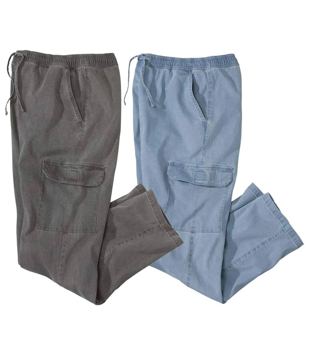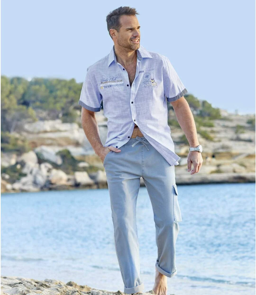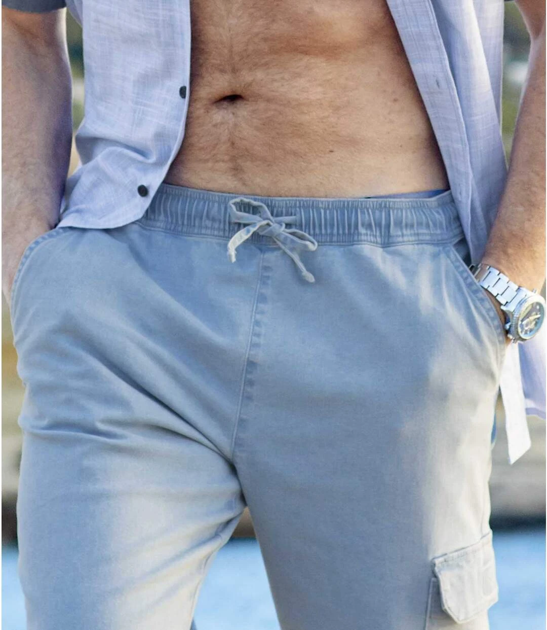 These jeans are easy to wear thanks to their lightweight stretch denim (8.5 oz.). They feature a fully elasticated waistband that adjusts using an outer drawstring and adapts to all figures. They also have 3 pockets: 2 Italian pockets and 1 hook-and-loop cargo pocket on the left thigh. Don’t miss this handy set of two for your summer wardrobe! Denim: 98% cotton, 2% elastane. Inner leg: approx. 33 in/84 cm and hem: approx. 8.7 in/22 cm for CA size M. Machine wash at 30°C. Colour: light blue and grey / Ref.: H6101
