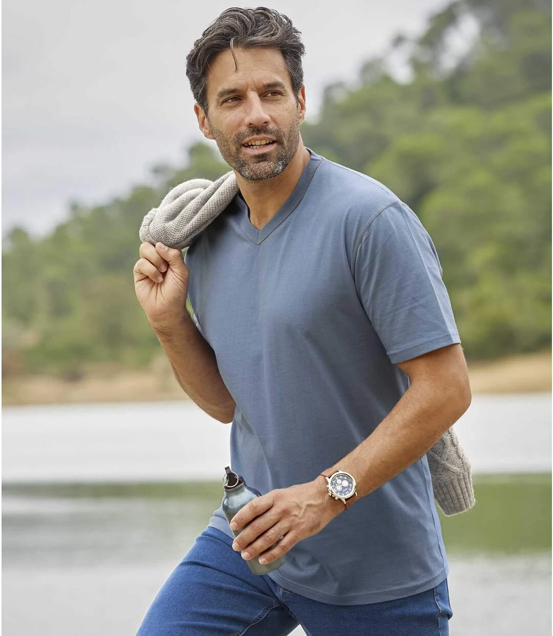These short sleeve V-neck t-shirts are closet staples. Made from soft cotton (approx. 160 g/m²) they feature contrasting topstitching on the collar and armholes, as well as 1×1 ribbing at the collar. 100% cotton. Back length: approx. 29.1 in/74 cm for CA size M. Machine wash at 30°C. Colour: navy, blue-grey and yellow – Ref: J6130